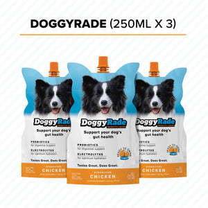 DoggyRade contains prebiotics and electrolytes, making it ideal for maintaining your dog's digestive and hydration health. DoggyRade is a healthy, natural, ready-to-use drink, that helps to support good intestinal health, better digestion, and improved nutrient absorption in dogs. It is packed full of essential amino acids and electrolytes to help with fast hydration. DoggyRade is low-calorie, low-fat, gluten and grain-free, and hypoallergenic. DoggyRade can also be frozen, to provide a cold refreshing treat, while providing all the same benefits. DoggyRade, much more than just water!