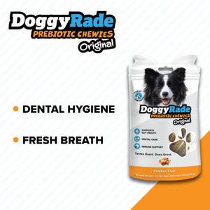 DoggyRade Chewies are tasty prebiotic chews to support your dog's immune and intestinal health. It contains natural fiber prebiotics to promote the growth of beneficial bacteria in the gut.