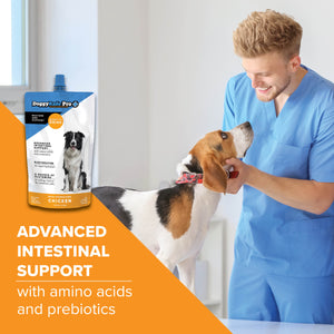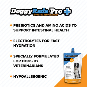 DoggyRade Pro is an isotonic rehydration drink for dogs, formulated for sick or critical ill patients. It helps dogs recover from intestinal disorders such as acute diarrhea and supports rehydration. It is helpful in support of gastroenteritis, pancreatitis, and other illnesses. DoggyRade Pro contains amino acids, prebiotics and balanced electrolytes, to facilitate the replacement of those lost due to illness. It helps restore hydration and can be used in all dogs over six weeks of age.