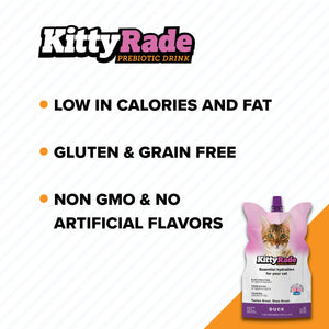 KittyRade is an award-winning prebiotic drink that encourages reliable hydration in cats. It contains a mix of sugars (carbohydrates), electrolytes, and amino acids including glutamic acid which is beneficial for intestinal function, and taurine, an essential amino acid which promotes eye and heart health. It also contains prebiotics that increase the activity of beneficial microorganisms in the gut. These prebiotics support good gut health, and improve digestion and nutrient absorption.