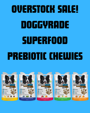 For a limited time, DoggyRade is offering an overstock sale on these Superfood Chewies, FLAVORS WILL VARY PER ORDER. DoggyRade Prebiotic Superfood Chewies are nutritious treats designed to support your dog's gut and immune health. They contain natural fiber prebiotics that promote the growth of beneficial bacteria in the gut. Their unique shape aids in daily tartar and plaque removal, contributing to better dental hygiene. These chews are available in five delicious flavors: