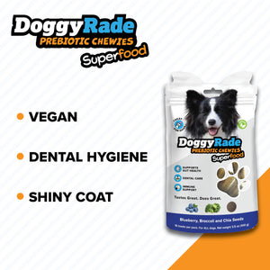 | DoggyRade Prebiotic Superfood Chewies are a range of tasty and healthy treats for dogs that support their immune and intestinal health. These chews contain natural fiber prebiotics to promote the growth of beneficial bacteria in the gut. They offer added functional benefits to our existing prebiotic treats for dogs. Blueberry and broccoli help to provide fiber. Their shape, thanks to the mechanical action, contributes to oral hygiene, helping the daily removal of tartar. Vegan and grain-free formula. Also suitable for sensitive dogs. Our full range of prebiotic chews helps support your dog’s: Gut Health • Dental Care • Immune Health • Digestive Health • Fresh Breath |