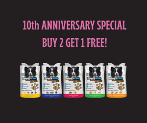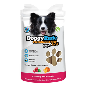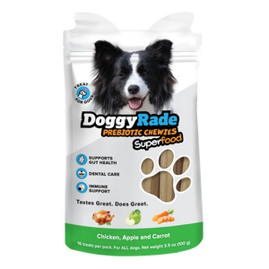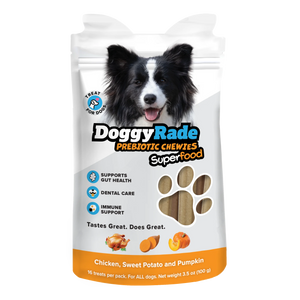 For a limited time, DoggyRade is offering a SPECIAL for our 10th ANNIVERSARY. BUY 1 Superfood Chewies GET 2 FREE! FLAVORS WILL VARY PER ORDER. DoggyRade Prebiotic Superfood Chewies are nutritious treats designed to support your dog's gut and immune health. They contain natural fiber prebiotics that promote the growth of beneficial bacteria in the gut. Their unique shape aids in daily tartar and plaque removal, contributing to better dental hygiene. These chews are available in five delicious flavors: